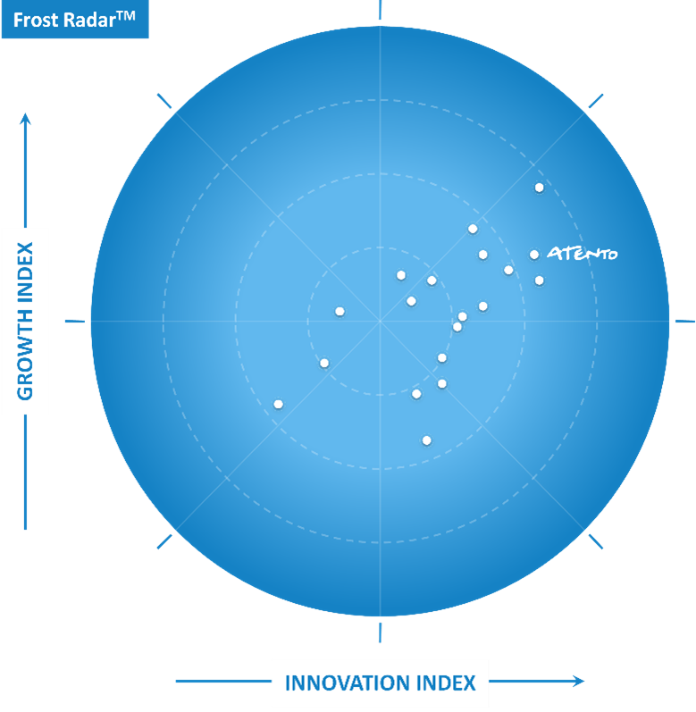 Due to the maturity of the outsourcing services market in Latin America, there is strong competition within the sector and innovation capabilities are a significant differentiator. With this in mind, Frost & Sullivan evaluated 19 companies in the CX industry in the region, based on their record of innovation and growth. As a result, Atento emerged as one of the leading companies in this Frost RadarTM, given its notable presence in the Innovation matrix, with a strong pipeline for future growth.